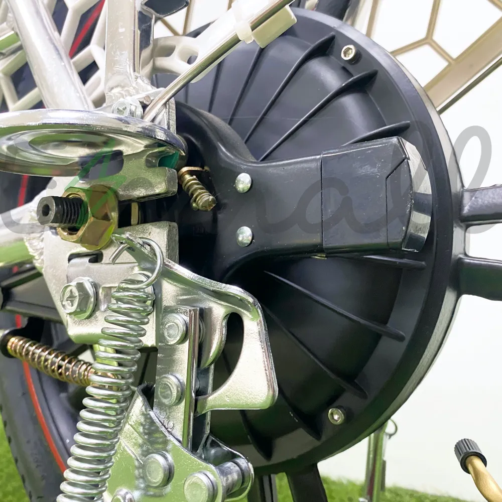 В комплекте идёт сменный аккумулятор, позволяющий пользоваться велосипедом ещё дольше! Двигателем велосипеда являются односкоростная практичная трансмиссия и электрический мотор-колесо, способный разогнать велосипед до 50 км/ч. Тормоза велосипеда – барабанные – способны остановить байк максимально эффективно. Колёса имеют размер 18 дюймов и делают Minako V8 Pro проходимым и манёвренным.