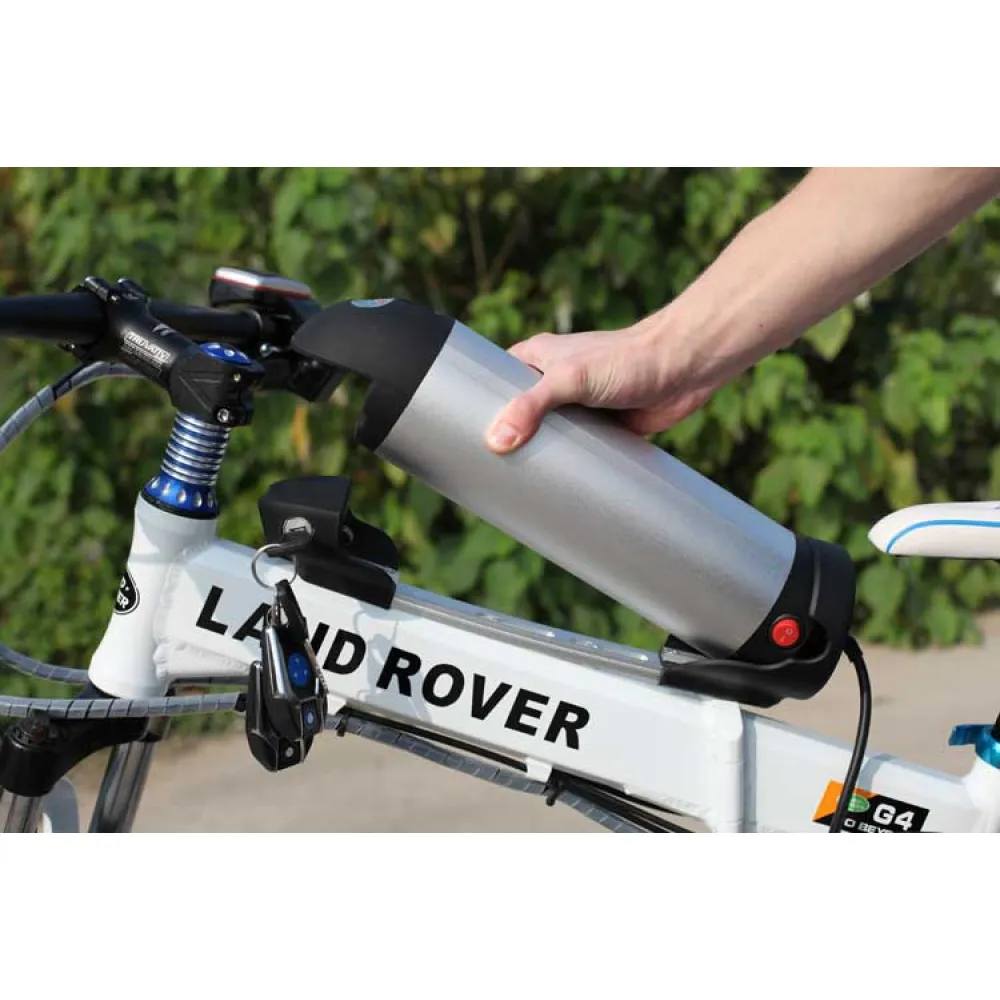 Электровелосипед LandRover имеет амортизацию вилки, тормозная система на два колеса дисковая. Световое освещение и информационную панель. Конструкция рамы достаточно прочная, выполнена из алюминия, складного типа. В сложенном состоянии легко помещается в багажник автомобиля.