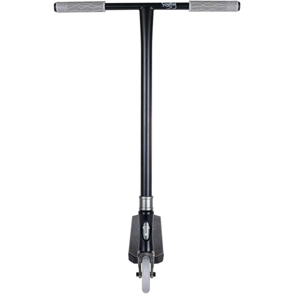 Самокат оснащен т-образным рулем и мягкими прорезиненными грипсами, благодаря которым риски соскальзывания рук при экстремальных действиях сведены к минимуму. По высоте от зажима руль составляет 63см, по ширине – 55 см.