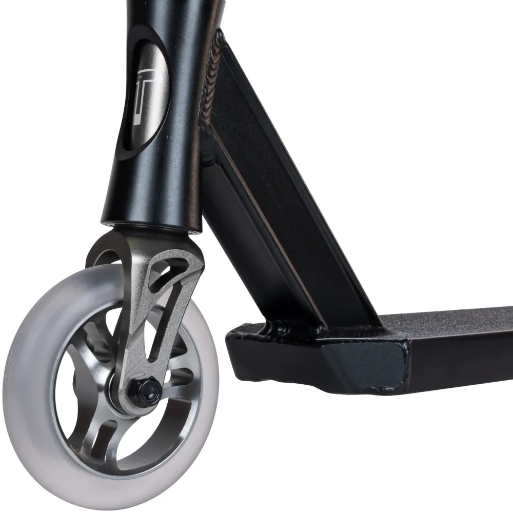 Колесная часть размером 110 мм изготовлена из мало стираемого полиуретана. Наличие алюминиевой фрезерованной вилки и фирменного заднего тормоза райдер может рассчитывать на качественный безопасный отскок.